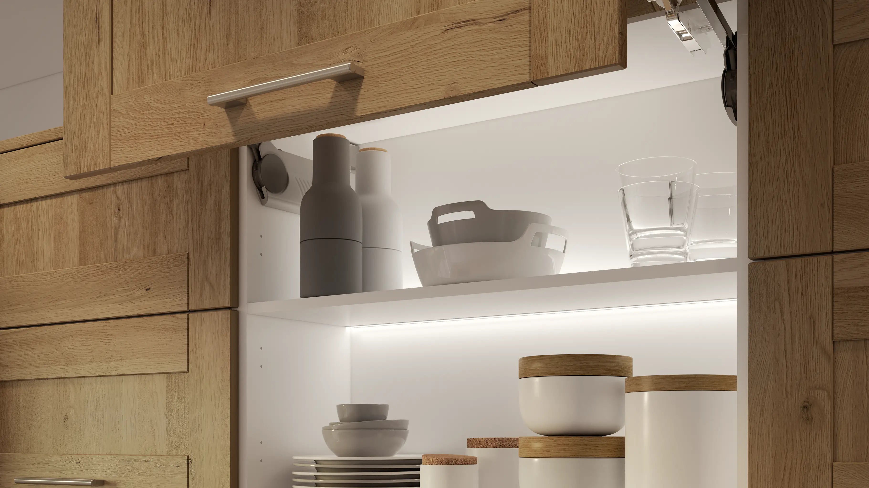 A discreet profile that clips onto the back of an internal cupboard shelf and illuminates both up and down the cabinet back.