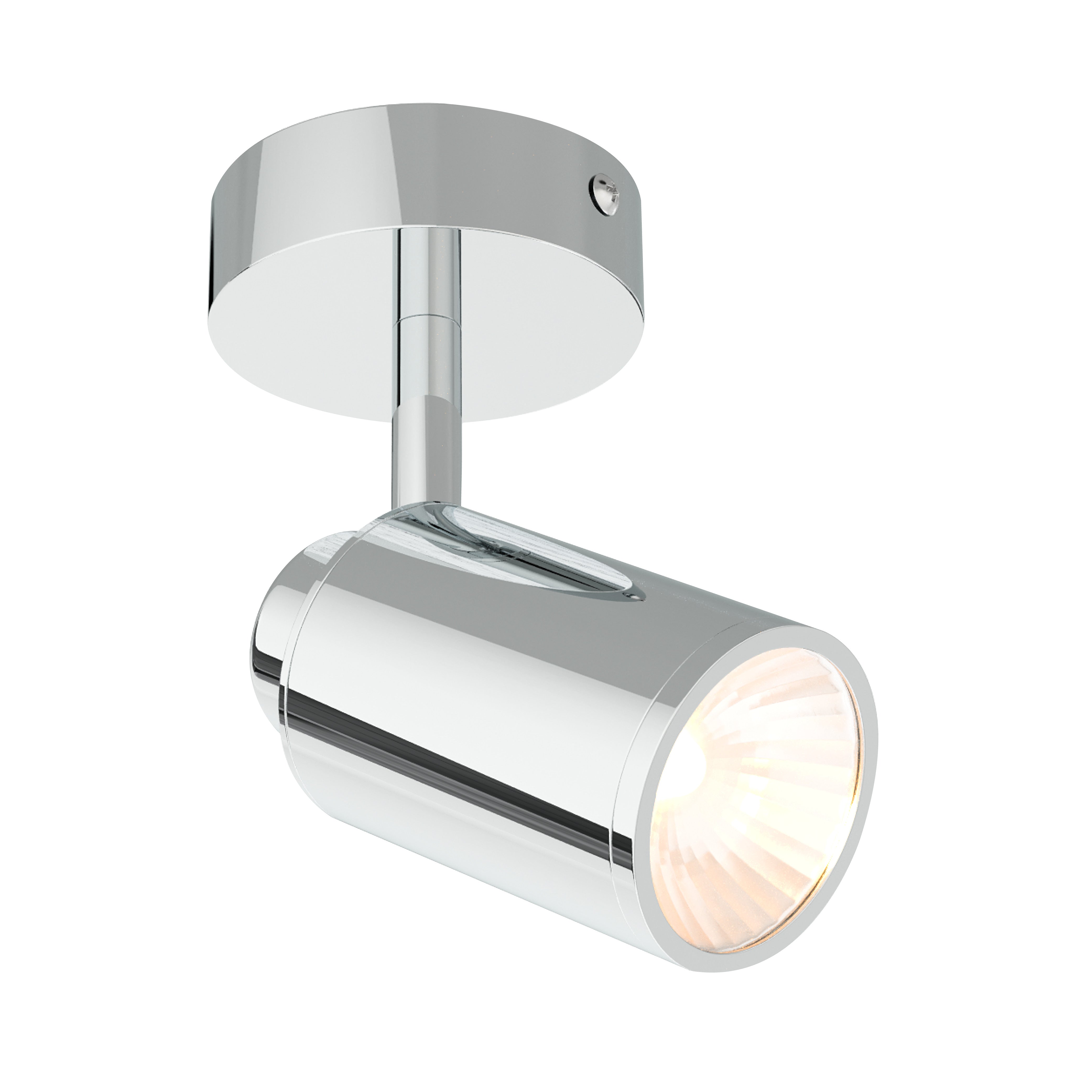Chrome finish bathroom spotlight on a circular base with adjustable head. Available as a single spotlight and triple spotlight design. Requires GU10 bulbs (bulbs not included).